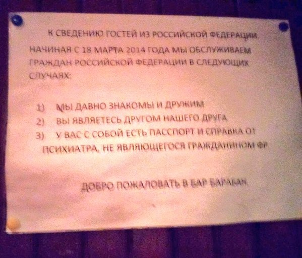 На листике в шутливой форме в 3 пунктах написано, при каких условиях в заведении будут обслуживать посетителей кафе из РФ.