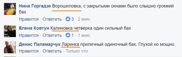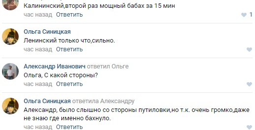 «ОЦКБ. Донецк, мощный бах», «12:45, Донецк, сильные взрывы, два подряд», «Ленинский, взрыв, еще один, очень сильно», «Кировский бахают», «Калинский, привет от «русского мира», уже четвертый взрыв за час», «В сторону Путиловки очень мощно слышно», » Киевский тоже хорошо слышно», — рассказывают в перекличках донецких групп пользователи.
