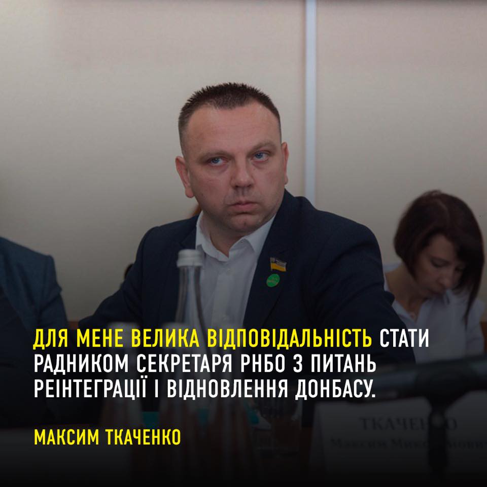 У депутата заявили, що він буде займатися питаннями реінтеграції та відновлення Донбасу. «Максим Ткаченко, народний депутат від політичної партії« Слуга Народу », став радником секретаря Ради національної безпеки і оборони України», – йдеться в повідомленні.