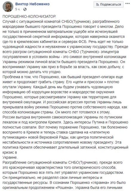«Речь идет не только чудовищной жадности и неуважении к украинскому государству. Прежде всего, разгром ситуационной комнаты СНБО — эпицентра госуправления в условиях войны — это символ внутренней колонизации Украины режимом личной власти бывшего президента Порошенко. Он воспринимал Украину как приз в борьбе за власть, как свою добычу, с которой можно делать что угодно. Проблема в том, что Порошенко, как бывший президент-олигарх еще живет и продолжает грабить страну», - отметил он.